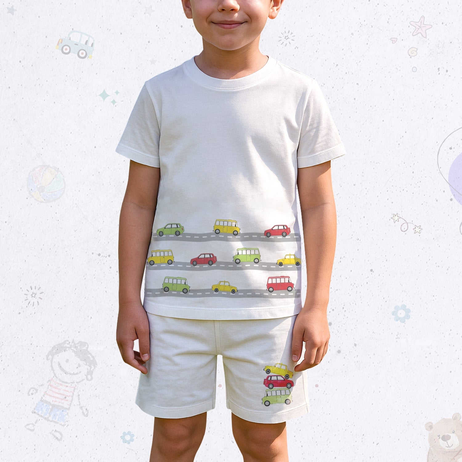 Vroom, vroom! Get ready for a speedy trip to dreamland with the Boy's Car PJ Set in White! This cozy must-have features a short-sleeved t-shirt with an awesome car graphic in a fun semi-rubber print, perfect for little racers who love to zoom through their adventures, even in their sleep! The matching jersey shorts are covered in cute, colorful cars, adding even more fun to this bedtime look.
