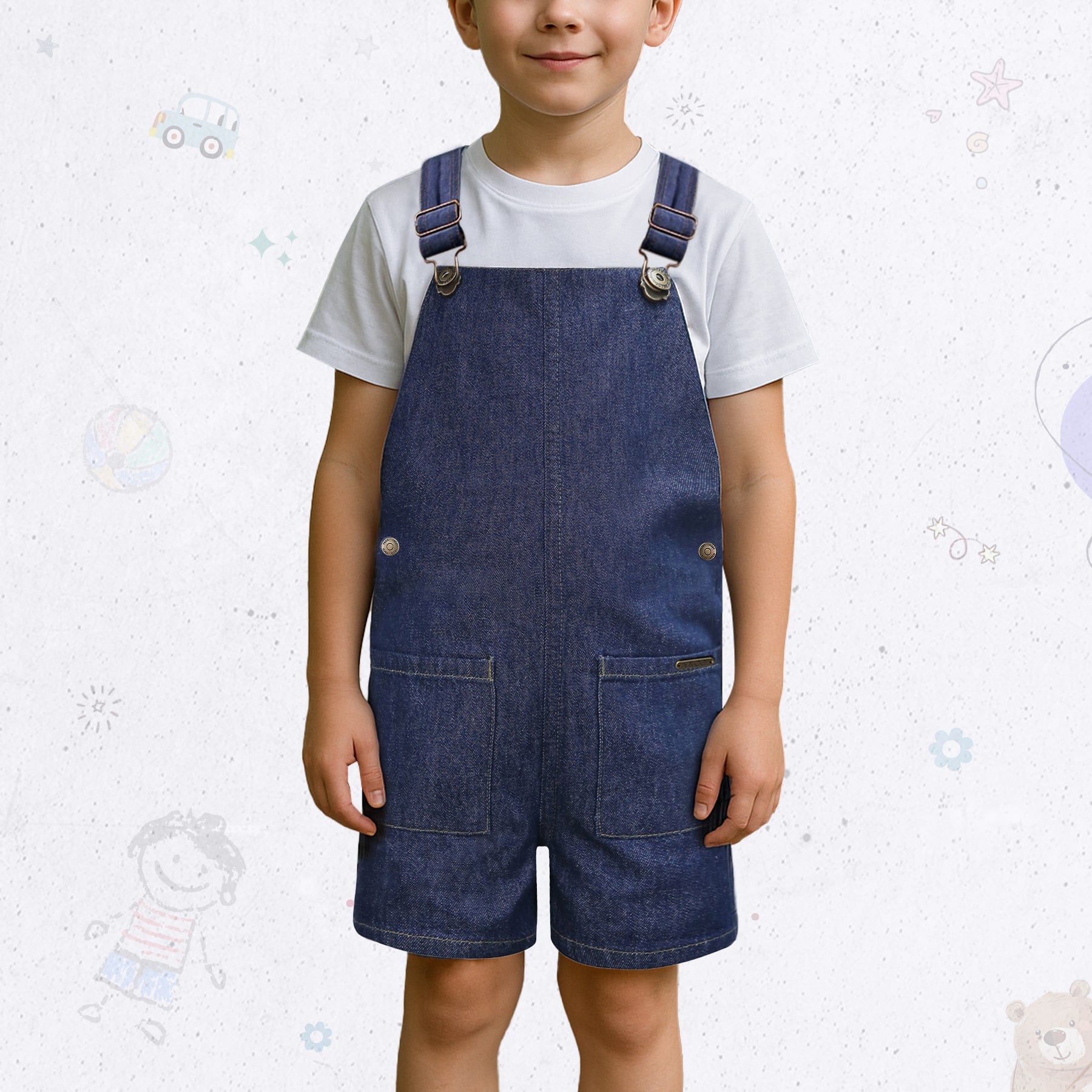 Get your little explorer ready for fun-filled days with Boy's Denim Dungaree! Made from soft, breathable cotton denim, this regular fit dungaree ensures both comfort and style for your little one. The adjustable clip-on shoulder straps grow with him, offering a perfect fit, while the cute front patch pockets are ideal for stashing tiny treasures or just looking extra adorable. The shank button on the top yoke and snap buttons on the side waist make dressing up a breeze, even on the busiest mornings. Playing at the park or on a family outing, this 100% Cotton dungaree is versatile and stylish enough to pair with any basic t-shirt for an effortlessly cool, casual look. Durable, comfy, and packed with playful details like a metal badge and buttons, this everyday dungaree will be your boy’s go-to outfit for every adventure. Time to let him roam in style!