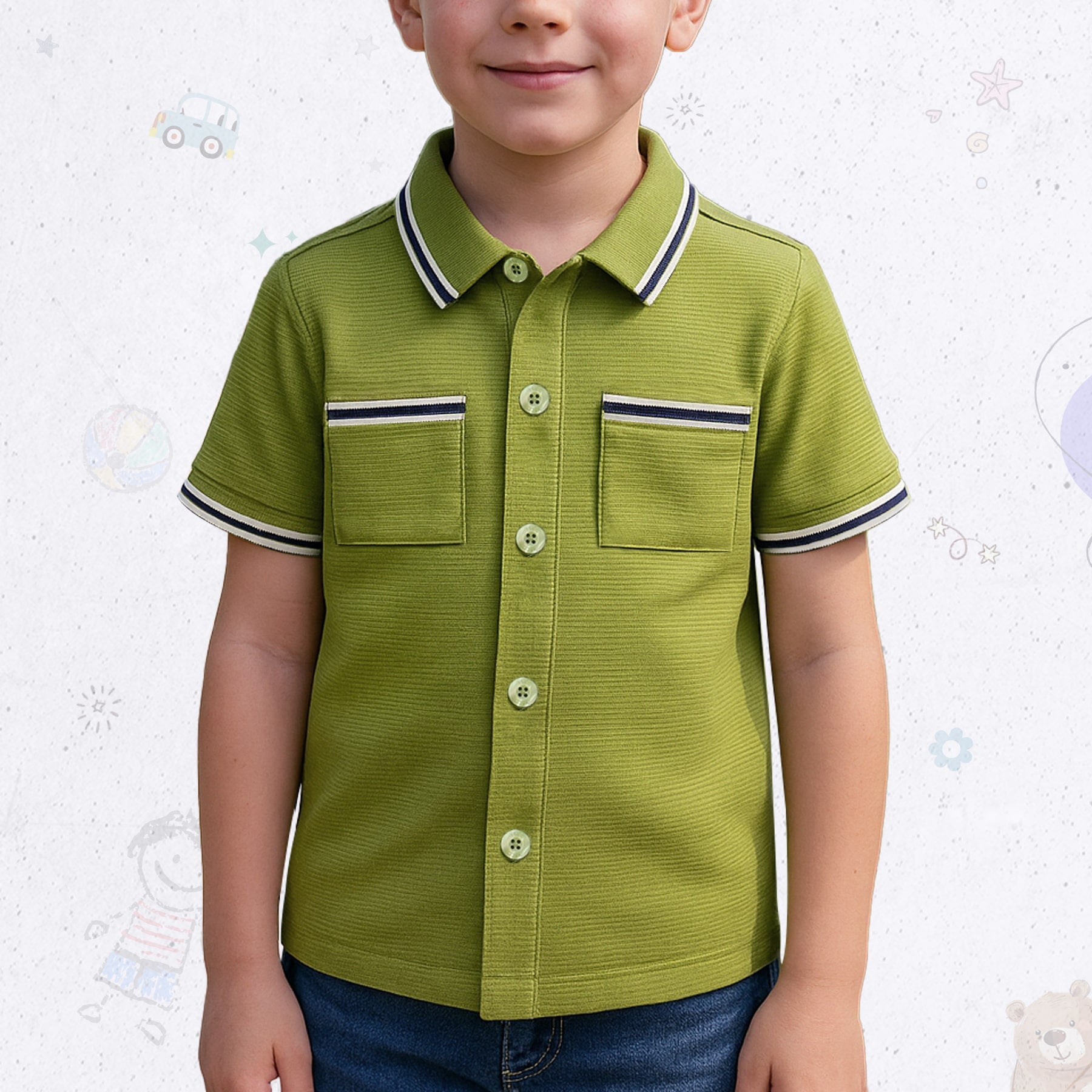 Boy’s Waffle Shirt in Olive Green – the perfect mix of cool and cozy! Made from a super soft cotton and polyester waffle, this shirt feels great while keeping him looking stylish. The 3-tone ribbed collar and sleeve cuffs add a playful pop of color, while the two front pockets are perfect for stashing all his little treasures. Plus, those coconut shell buttons give it a fun, textured twist!
