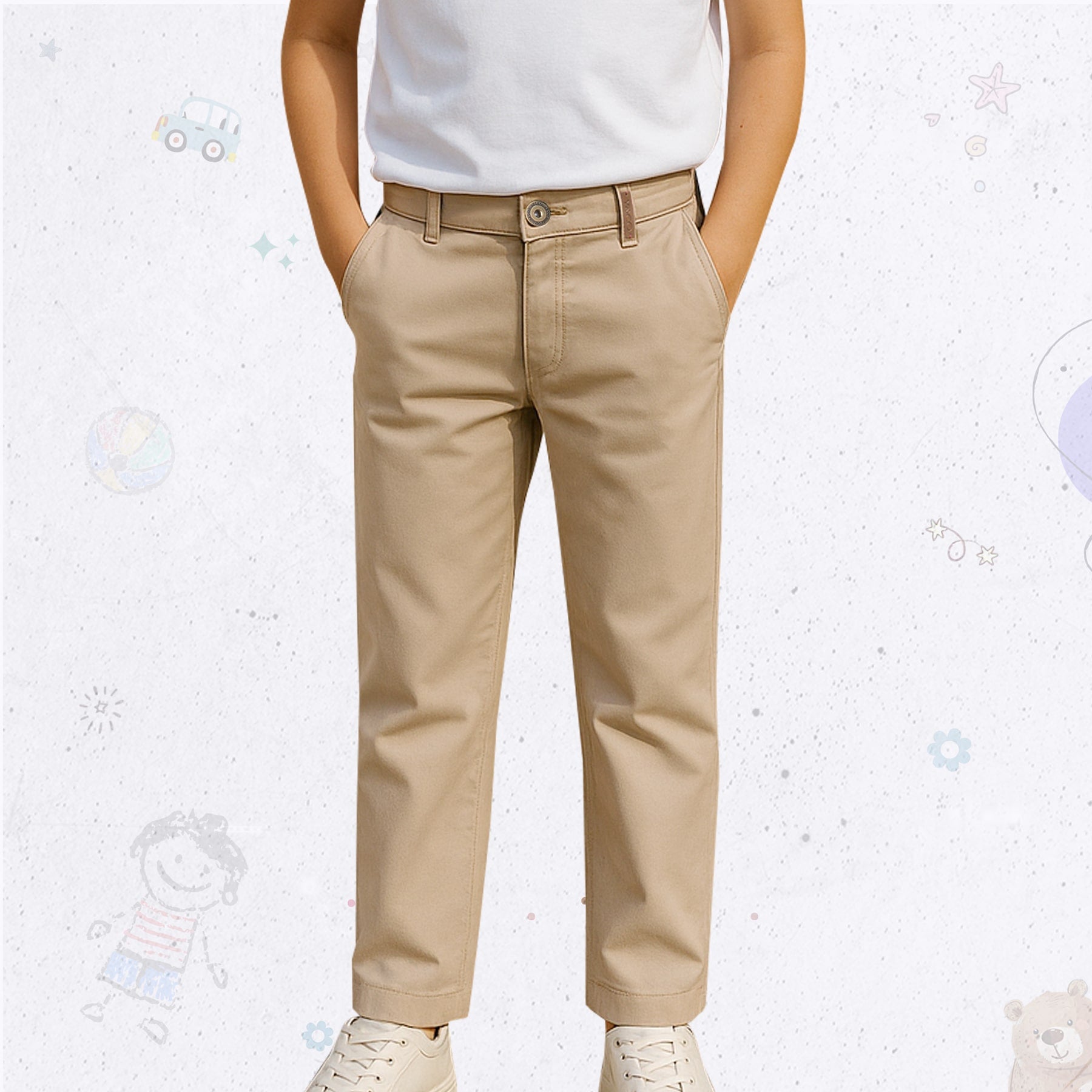 Upgrade your boy's casual wardrobe with these stylish regular-fit Boy’s Chino Pants. Crafted from a comfortable stretch cotton blend, these comfortable boys pants offer both ease of movement and a polished look. Featuring convenient side pockets and a back patch pocket for added utility, these kids chino pants are designed with a leather badge on the belt loop for a touch of classic style. The zipper fastening with an adjustable waist ensures a perfect fit as he grows. Ideal for any casual occasion, these versatile cotton stretch chinos are a must-have for effortless everyday wear.