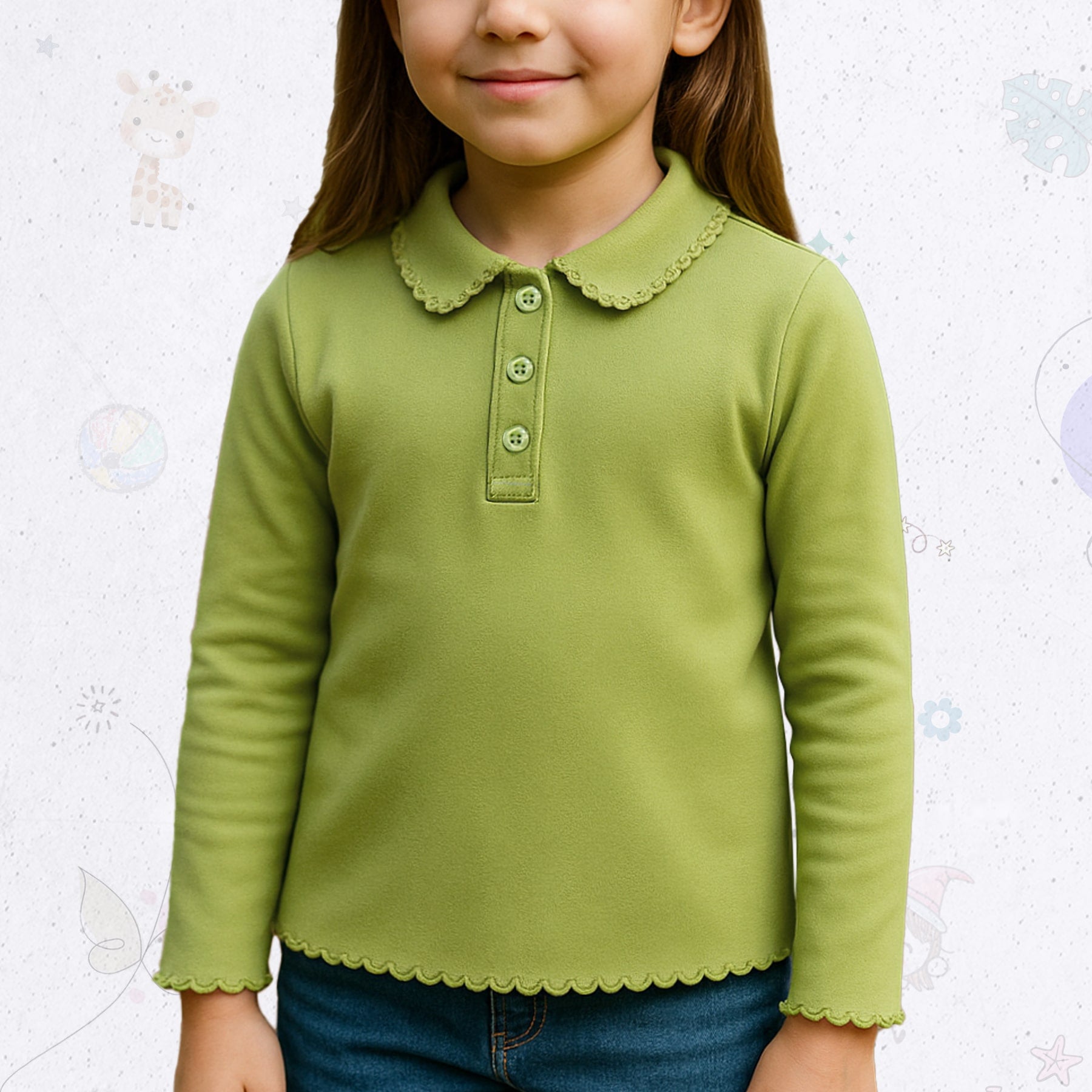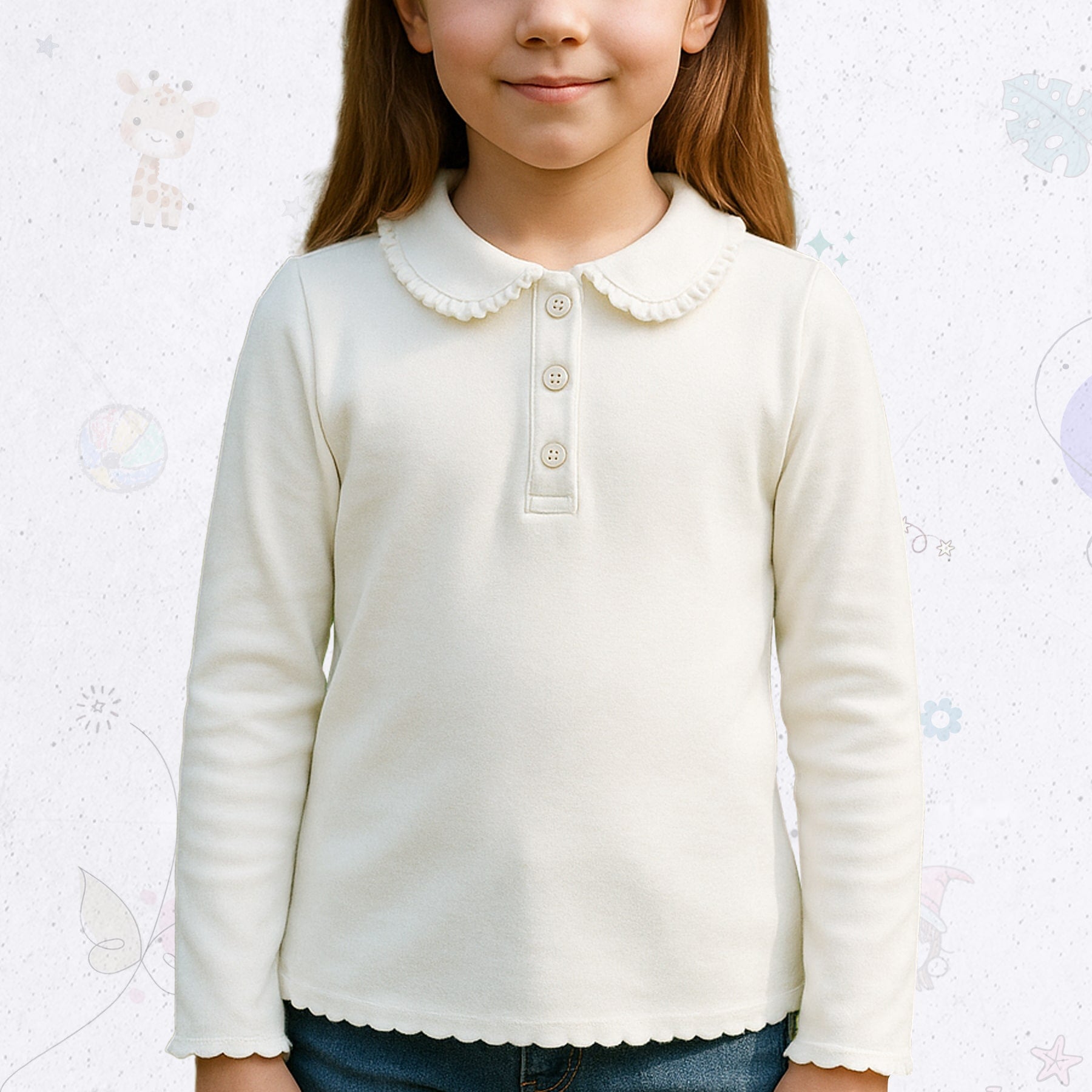 Your little one sure will love this effortless style with Girl’s Rib Polo! Crafted from soft cotton rib fabric, this soft cotton polo is all about comfort and charm. The full sleeves come adorned with a playful lettuce trim on the sleeve hem and bottom hem, adding a trendy twist to a classic design.Featuring a three-button placket and a self-fabric collar, this comfortable polo is perfect for layering or wearing solo. Whether she’s heading to school, playing with friends, or enjoying a family outing, this versatile piece is ideal for a relaxed, casual look. Pair this casual polo shirt with jeans, leggings, or a cute skirt for a chic yet comfy outfit she’ll love to wear!