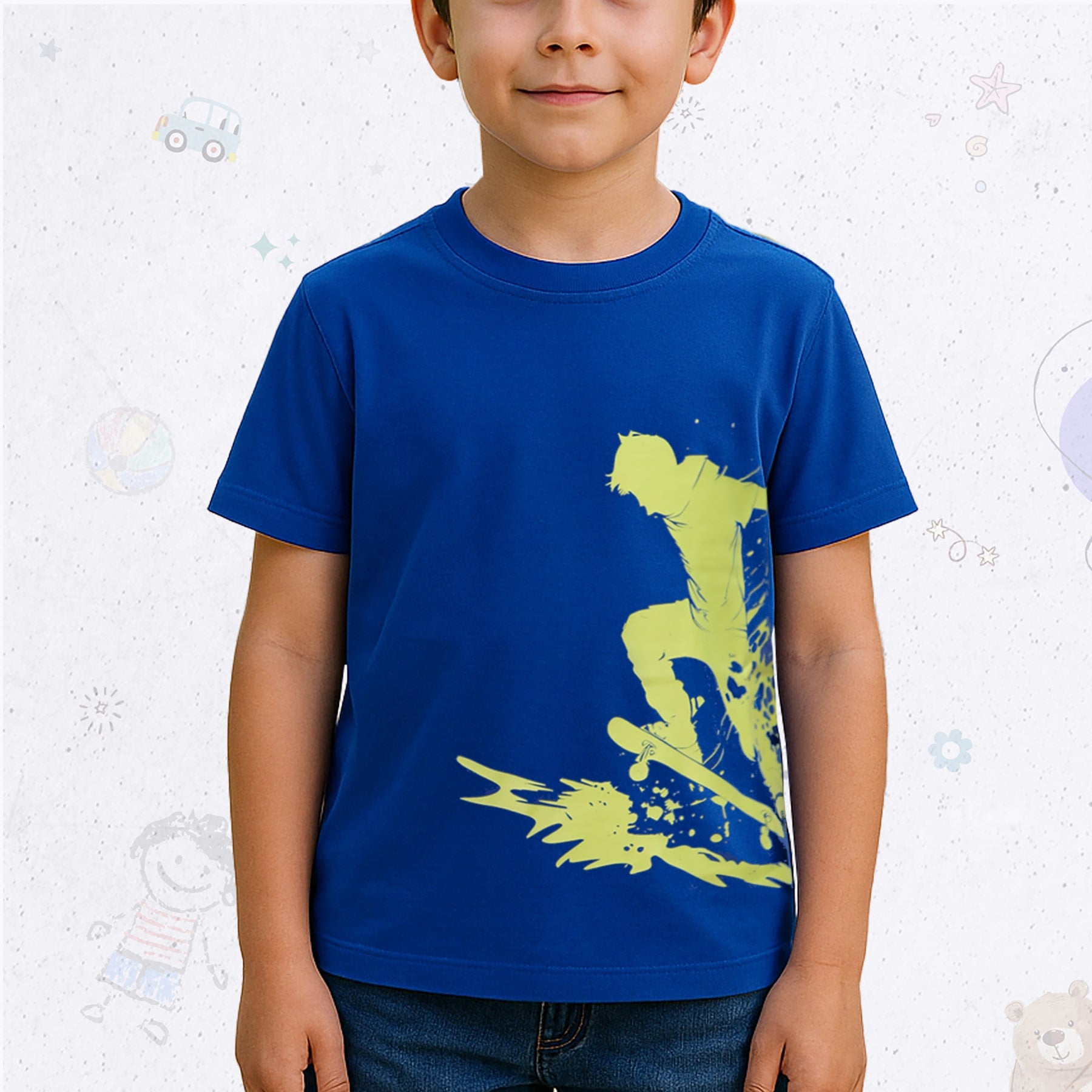 Roll with Boy’s Skating T-Shirt! This vibrant graphic tee is a must-have for any little sportster who loves to skate. Made from super-soft, pure cotton, this boys summer T-Shirt offers all-day comfort and breathability, perfect for those active adventures. The striking colors of the design pop against the white background, making this boys regular fit T-Shirt a standout piece in his wardrobe. Plus, you can rest easy knowing it’s free from harmful chemicals, ensuring it's safe for your little one. Pair this kids sports themed shirt with his favorite jeans and trainers for a stylish, sporty look that’s ready for the skate park or playground. Let the good times roll with this fun skating tee!